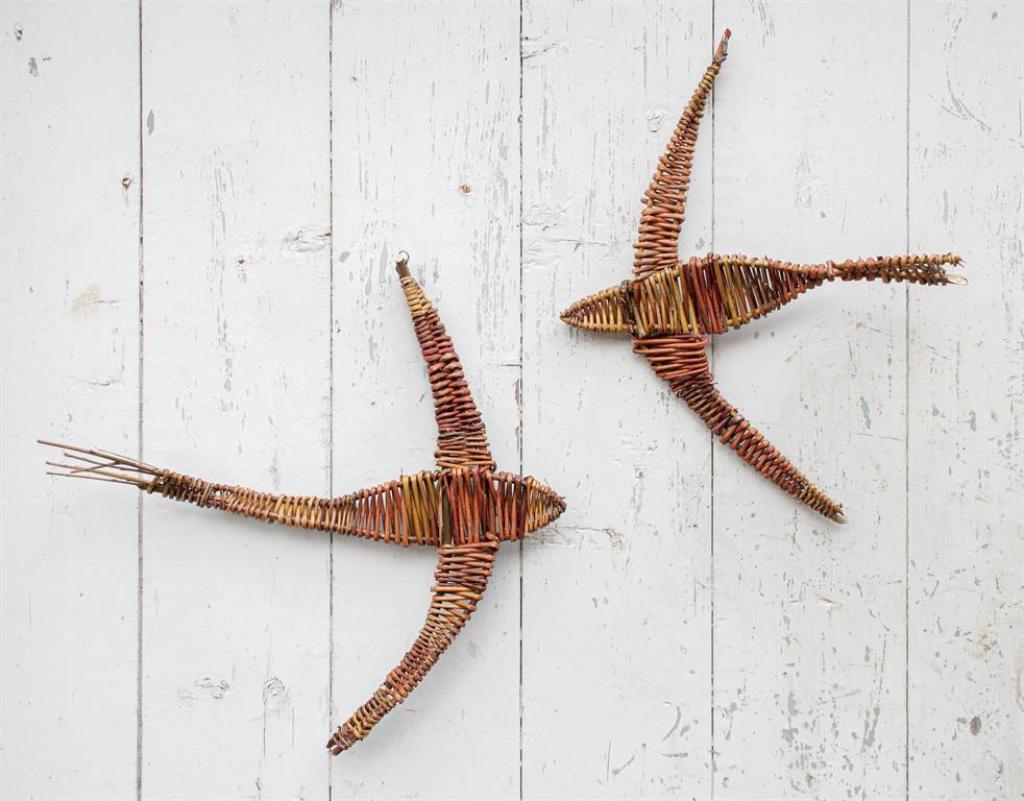 Aus einer Astgabel oder einer dickeren Rute formen wir das Grundgerüst. Die Flügel werden durch den Körper gezogen und alles wird mit verschiedenfarbiger Weide ausgeflochten. Es können auch mehrere Objekte sowie eigene Kreationen hergestellt werden.